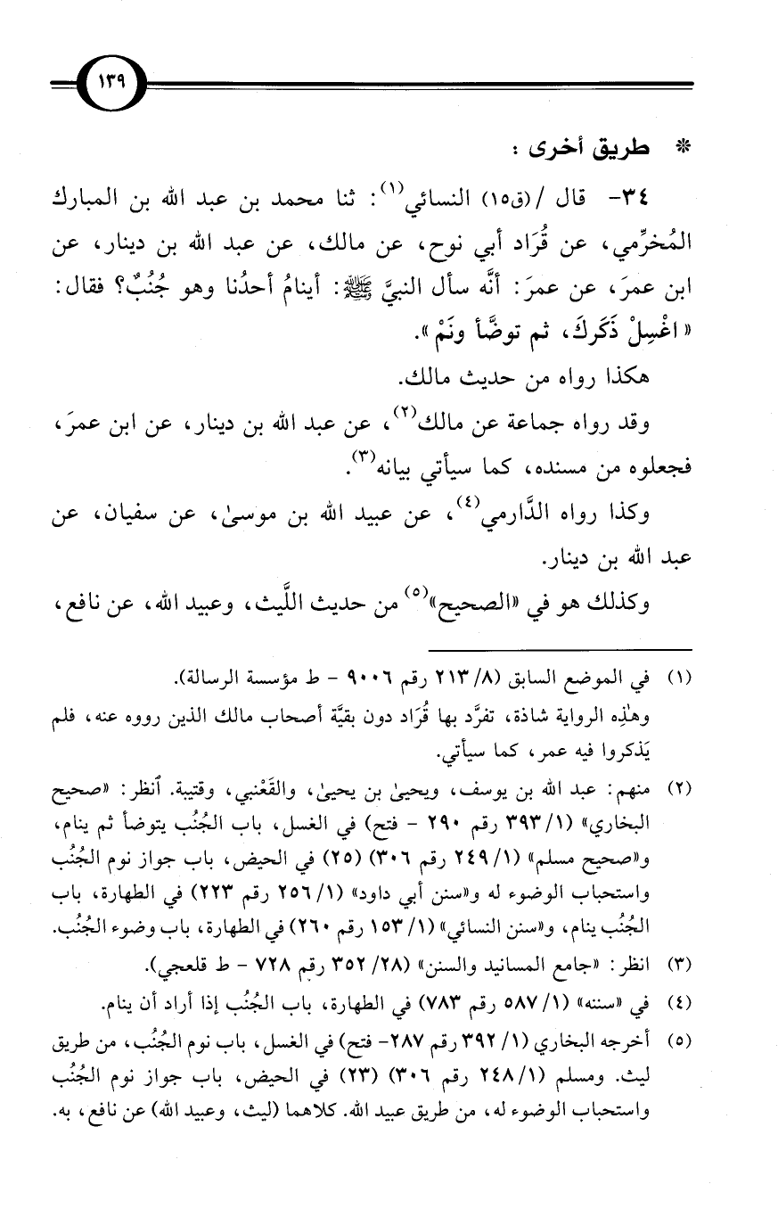 (34) قال / (ق 15) النسائي (¬1): ثنا محمد بن عبد الله بن المبارك المُخرِّمي، عن قُرَاد أبي نوح، عن مالك، عن عبد الله بن دينار، عن ابن عمرَ، عن عمرَ: أنَّه سأل النبيَّ صلى الله عليه وسلم: أينامُ أحدُنا وهو جُنُبٌ؟ فقال: «اغْسِلْ ذَكَركَ، ثم توضَّأ ونَمْ».