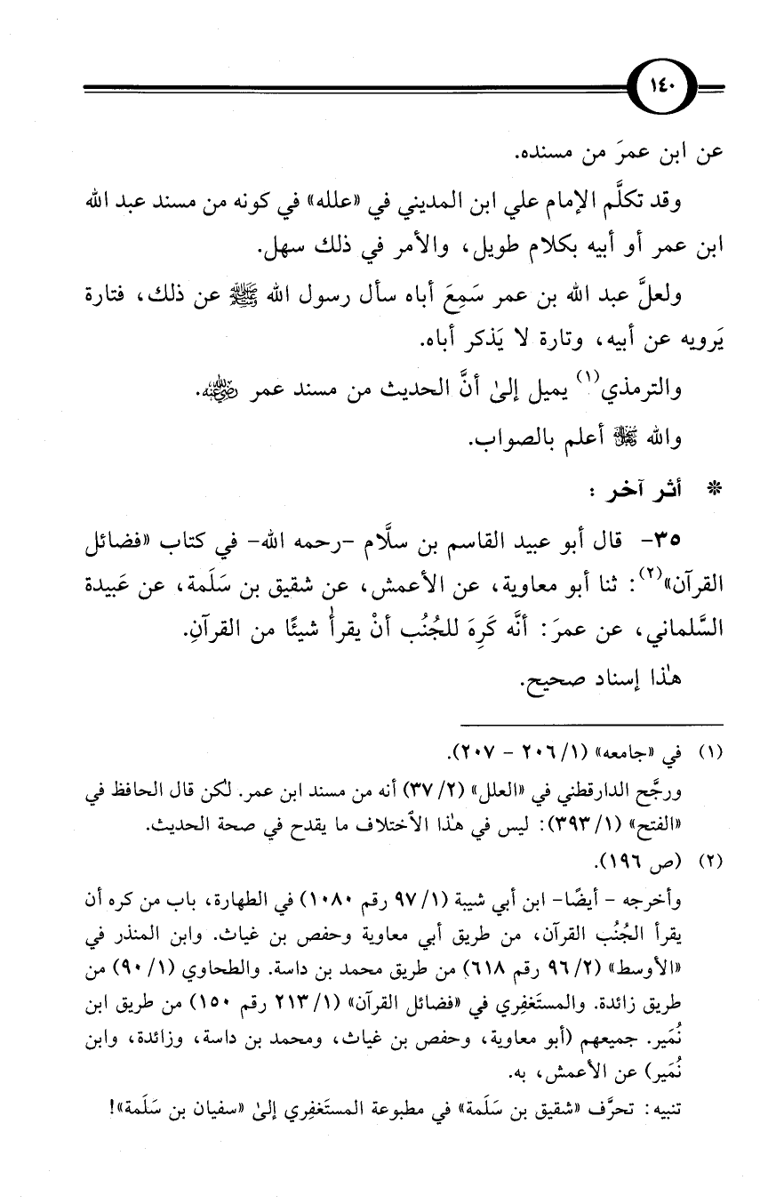 وقد تكلَّم الإمام علي ابن المديني في «علله» في كونه من مسند عبد الله بن عمر أو أبيه بكلام طويل، والأمر في ذلك سهل.