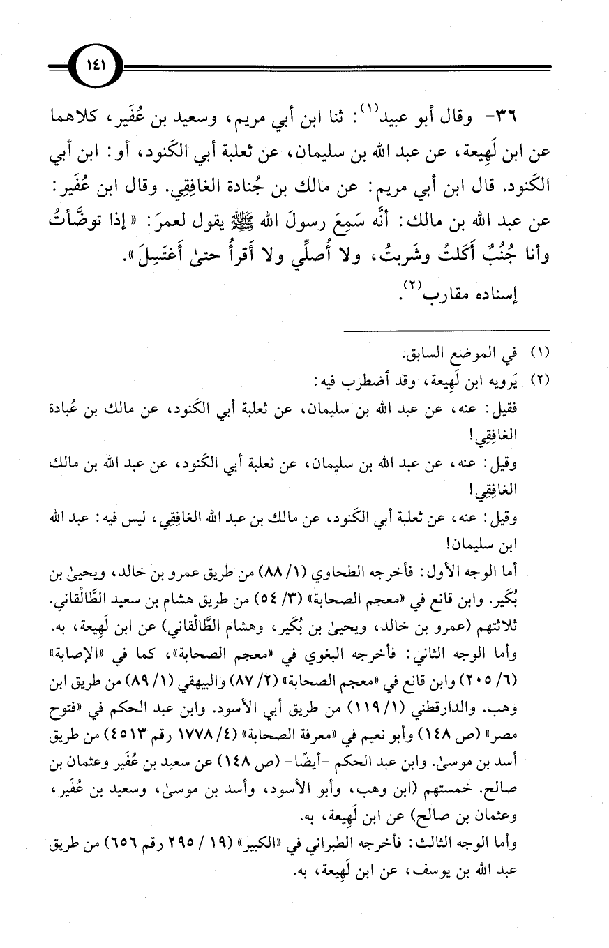 (36) وقال أبو عبيد (¬1): ثنا ابن أبي مريم، وسعيد بن عُفَير، كلاهما عن ابن لَهِيعة، عن عبد الله بن سليمان، عن ثعلبة أبي الكَنود، أو: ابن أبي الكَنود. قال ابن أبي مريم، عن مالك بن جُنادة الغافِقِي. وقال ابن عُفَير، عن عبد الله بن مالك: أنَّه سَمِعَ رسولَ الله صلى الله عليه وسلم يقول لعمرَ: «إذا توضَّأتُ وأنا جُنُبٌ أَكَلتُ وشَربتُ، ولا أُصلِّي ولا أَقرأُ حتى أَغتَسِلَ».