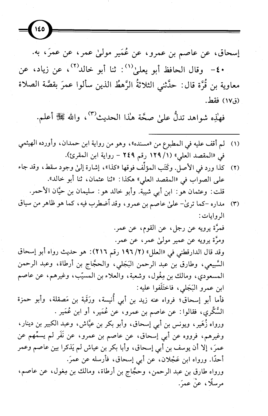 (40) وقال الحافظ أبو يعلى (¬1): ثنا أبو خالد (¬2)، عن زياد، عن معاوية بن قُرَّة قال: حدَّثني الثلاثةُ الرَّهطُ الذين سألوا عمرَ بقصَّة الصلاة / (ق 17) فقط.