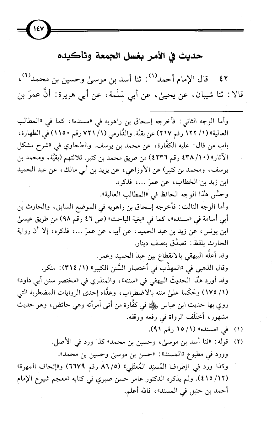 (42) قال الإمام أحمد (¬1): ثنا أسد بن موسى وحسين بن محمد (¬2)، قالا: ثنا شيبان، عن يحيى، عن أبي سَلَمة، عن أبي هريرة: أنَّ عمرَ بن