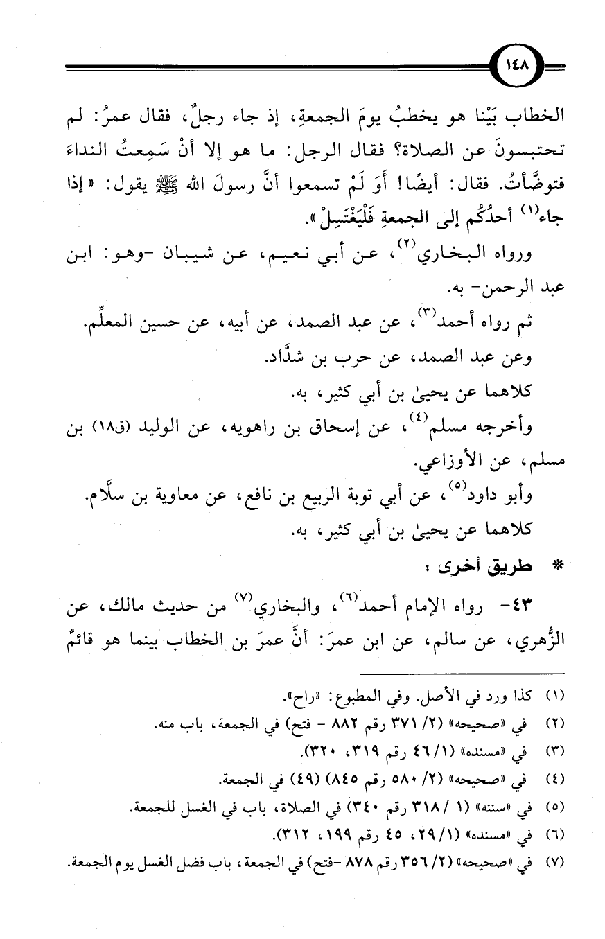 (¬7) في «صحيحه» (2/ 356 رقم 878 - فتح) في الجمعة، باب فضل الغسل يوم الجمعة.