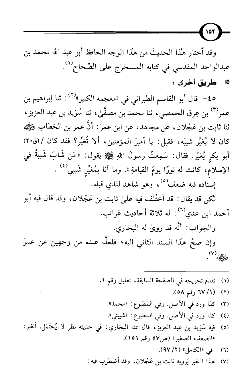 (45) قال أبو القاسم الطبراني في «معجمه الكبير» (¬2): ثنا إبراهيم بن عمر (¬3) بن عِرق الحمصي، ثنا محمد بن مصفَّى، ثنا سُوَيد بن عبد العزيز، ثنا ثابت بن عَجْلان، عن مجاهد، عن ابن عمرَ: أنَّ عمر بن الخطاب -رضي الله عنه- كان لا يُغيِّر شيبَه، فقيل: يا أميرَ المؤمنين، ألا تُغيِّر؟ فقد كان / (ق 20) أبو بكرٍ يُغيِّر. فقال: سَمِعتُ رسولَ اللهِ صلى الله عليه وسلم يقول: «مَن شَابَ شَيبةً في الإسلامِ، كانت له نورًا يومَ القيامةِ». وما أنا بمُغيِّرٍ شَيبي (¬4).