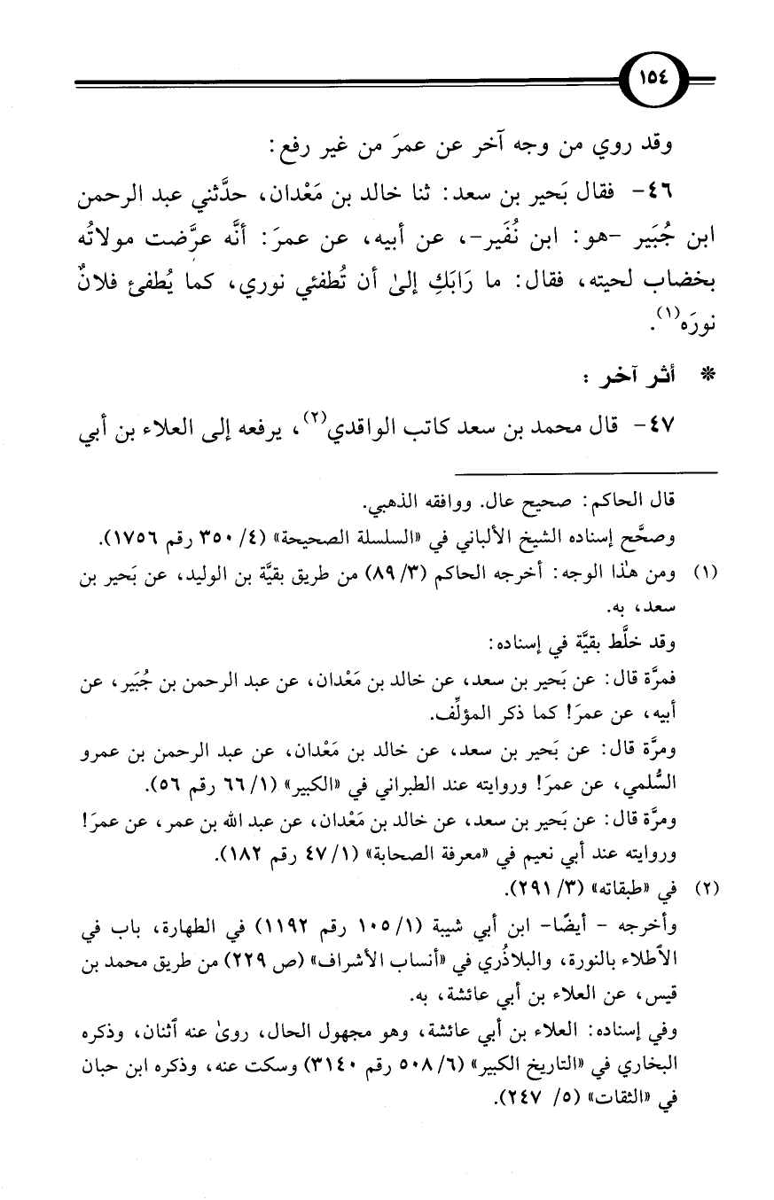 (46) فقال بَحير بن سعد: ثنا خالد بن مَعْدان، حدَّثني عبد الرحمن بن جُبَير -هو: ابن نُفَير-، عن أبيه، عن عمرَ: أنَّه عرَّضت مولاتُه بخضاب لحيته، فقال: ما رَابَكِ إلى أن تُطفئي نوري، كما يُطفئ فلانٌ نورَه (¬1).