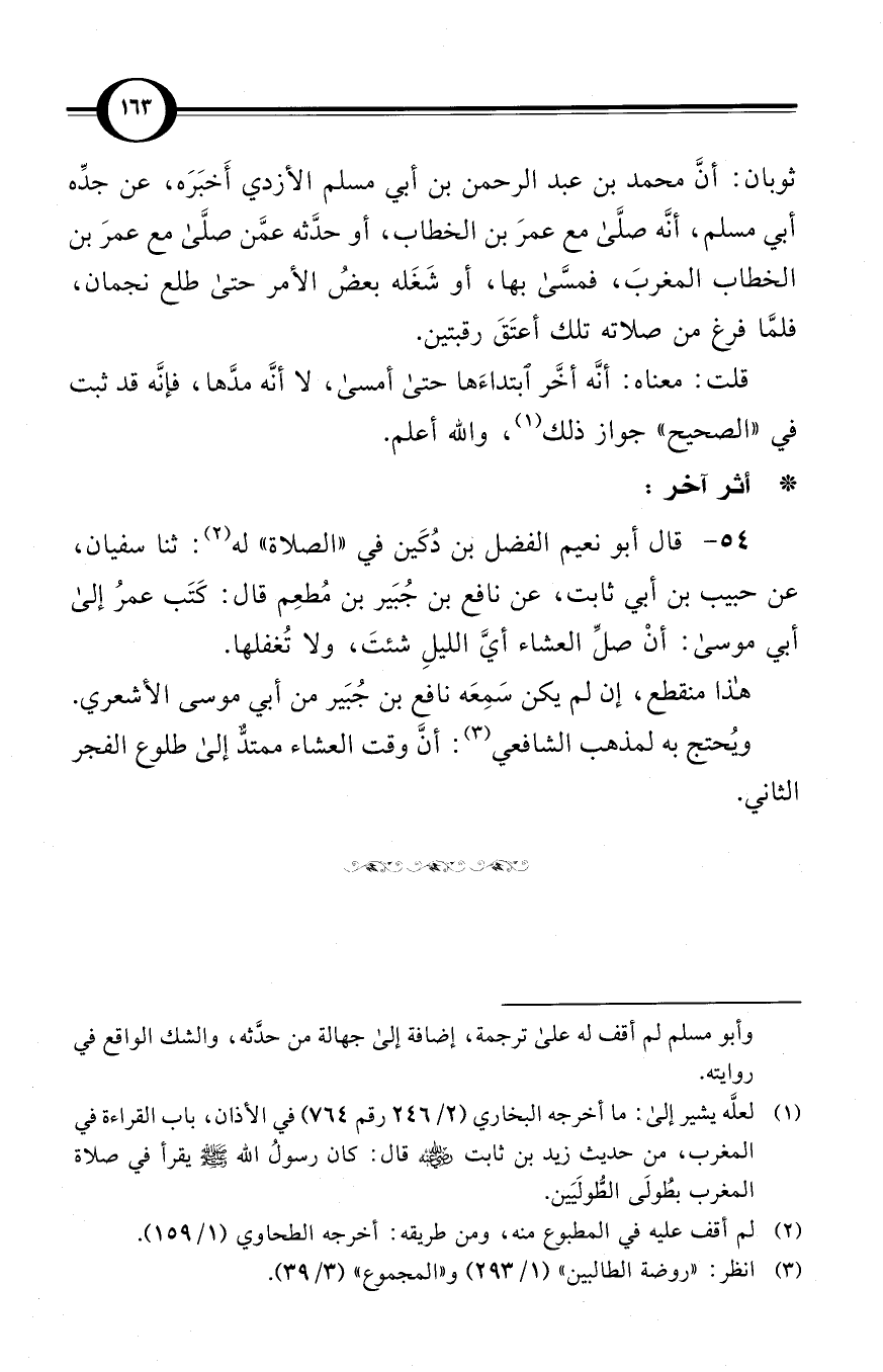 ثوبان: أنَّ محمد بن عبد الرحمن بن أبي مسلم الأزدي أَخبَرَه، عن جدِّه أبي مسلم، أنَّه صلَّى مع عمرَ بن الخطاب، أو حدَّثه عمَّن صلَّى مع عمرَ بن الخطاب المغربَ، فمسَّى بها، أو شَغَله بعضُ الأمر حتى طلع نجمان، فلمَّا فرغ من صلاته تلك أعتَقَ رقبتين.