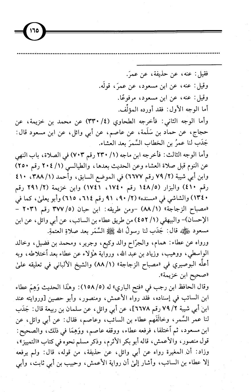 وقال الحافظ ابن رجب في «فتح الباري» له (5/ 158): وهذا الحديث وَهِمَ عطاء بن السائب في إسناده، فقد رواه الأعمش، ومنصور، وأبو حصين [وروايته عند ابن أبي شيبة 2/ 79 رقم 6678]، عن أبي وائل، عن سلمان بن ربيعة قال: جَدَب لنا عمر السَّمر، وخالَفَهم عطاء بن السائب، وعاصم، فقال: عن أبي وائل، عن ابن مسعود، ثم اختلفا، فرفعه عطاء، ووقفه عاصم، ووَهِمَا في ذلك، والصحيح: قول منصور، والأعمش، قاله أبو بكر الأثرم، وذكر مسلم نحوه في كتاب «التمييز»، وزاد: أن المغيرة رواه عن أبي وائل، عن حذيفة، من قوله، قال: ولم يرفعه إلا عطاء بن السائب، وأشار إلى أن رواية الأعمش، وحبيب بن أبي ثابت، وأبي حصين، عن أبي وائل، عن سليمان، عن عمرَ هي الصحيحة؛ لأنهم أحفظ وأولى بحسن الضبط للحديث.