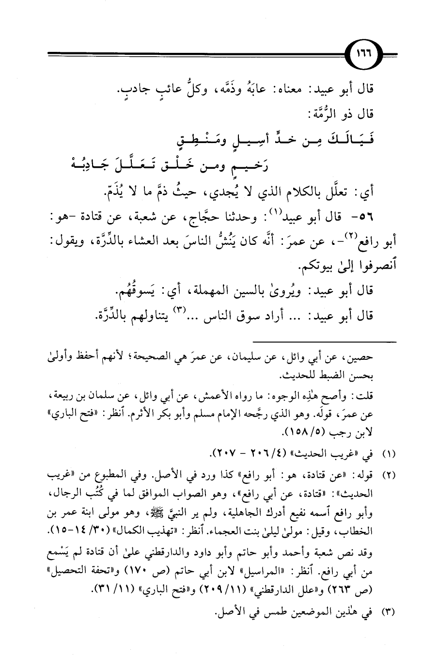 (56) قال أبو عبيد (¬1): وحدثنا حجَّاج، عن شعبة، عن قتادة -هو: أبو رافع (¬2) -، عن عمرَ: أنَّه كان يَنُشُّ الناسَ بعد العشاء بالدِّرَّة، ويقول: انصرفوا إلى بيوتكم.