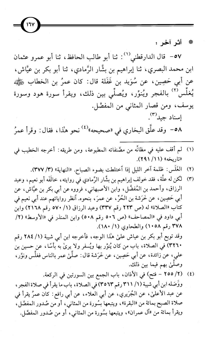 (57) قال الدارقطني (¬1): ثنا أبو طالب الحافظ، ثنا أبو عمرو عثمان بن محمد البصري، ثنا إبراهيم بن بشَّار الرَّمادي، ثنا أبو بكر بن عيَّاش، عن أبي حَصِين، عن سُوَيد بن غَفَلة قال: كان عمرُ بن الخطاب -رضي الله عنه- يُغلِّس (¬2) بالفجر ويُنوِّر، ويُصلِّي بين ذلك، ويقرأ سورة هود وسورة يوسف، ومن قصار المثاني من المفصَّل.