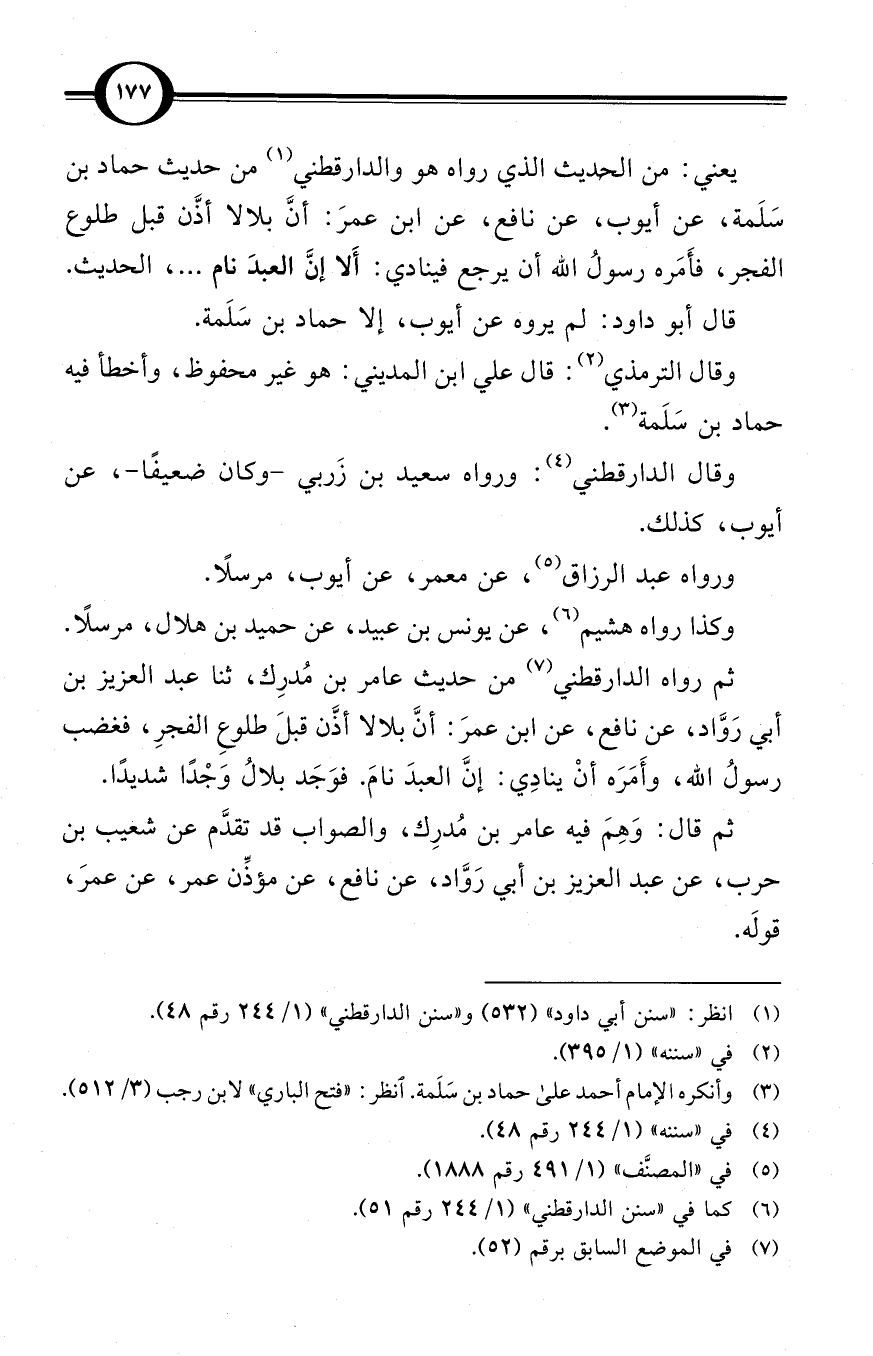 يعني: من الحديث الذي رواه هو والدارقطني (¬1) من حديث حماد بن سَلَمة، عن أيوب، عن نافع، عن ابن عمرَ: أنَّ بلالا أذَّن قبل طلوع الفجر، فأَمَره رسولُ الله أن يرجع فينادي: أَلا إنَّ العبدَ نام ... ، الحديث.