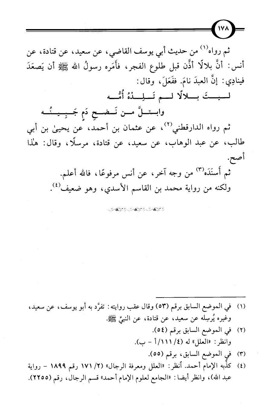 (¬1) في الموضع السابق برقم (53) وقال عقب روايته: تفرَّد به أبو يوسف، عن سعيد، وغيره يُرسِله عن سعيد، عن قتادة، عن النبيِّ صلى الله عليه وسلم.