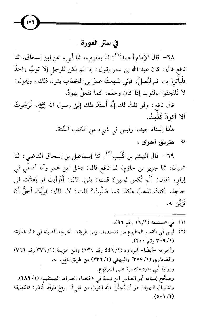 (68) قال الإمام أحمد (¬1): ثنا يعقوب، ثنا أبي، عن ابن إسحاق، ثنا نافع قال: كان عبد الله بن عمر يقول: إذا لم يكن للرجلِ إلا ثوبٌ واحدٌ فلْيأْتزِرْ به، ثم ليُصلِّ، فإني سَمِعتُ عمرَ بن الخطاب يقول ذلك، ويقول: لا تَلتَحِفوا بالثوب إذا كان وحدَه، كما تفعلُ يهودُ.