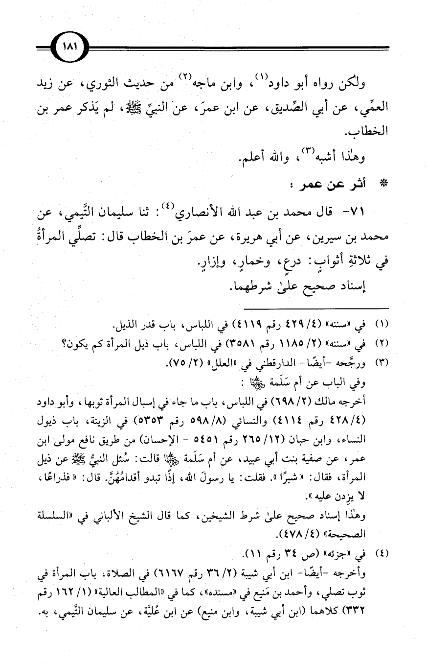 (71) قال محمد بن عبد الله الأنصاري (¬4): ثنا سليمان التَّيمي، عن محمد بن سيرين، عن أبي هريرة، عن عمرَ بن الخطاب قال: تصلِّي المرأةُ في ثلاثةِ أثوابٍ: درعٍ، وخمارٍ، وإزارٍ.
