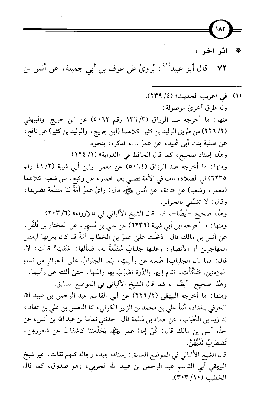 ومنها: ما أخرجه البيهقي (2/ 226) عن أبي القاسم عبد الرحمن بن عبيد الله الحرفي ببغداد، أنبأ علي بن محمد بن الزبير الكوفي، ثنا الحسن بن علي بن عفان، ثنا زيد بن الحُبَاب، عن حماد بن سَلَمة قال: حدثني ثمامة بن عبد الله بن أنس، عن جدِّه أنس بن مالك قال: كُنّ إماءُ عمرَ -رضي الله عنه- يَخدُمننا كاشفاتٌ عن شعورِهِن، تَضطربُ ثُدُيُّهُنَّ.