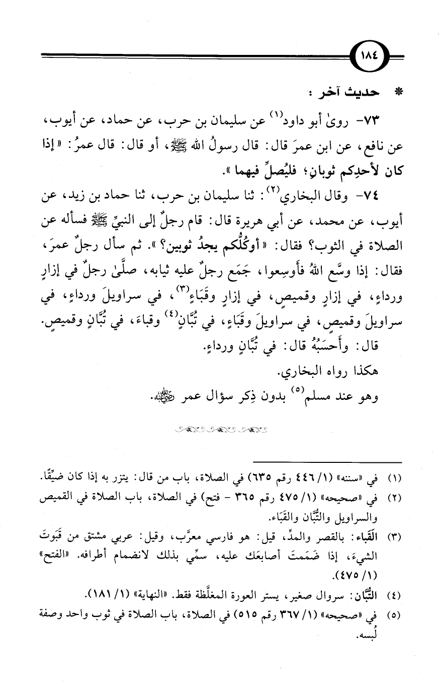 (74) وقال البخاري (¬2): ثنا سليمان بن حرب، ثنا حماد بن زيد، عن أيوب، عن محمد، عن أبي هريرة قال: قام رجلٌ إلى النبيِّ صلى الله عليه وسلم فسأله عن الصلاة في الثوب؟ فقال: «أوكُلُّكم يجدُ ثوبين؟». ثم سأل رجلٌ عمرَ، فقال: إذا وسَّع اللهُ فأَوسِعوا، جَمَع رجلٌ عليه ثيابه، صلَّى رجلٌ في إزارٍ ورداءٍ، في إزارٍ وقميصٍ، في إزارٍ وقَبَاءٍ (¬3)، في سراويلَ ورداءٍ، في سراويلَ وقميصٍ، في سراويلَ وقَبَاءٍ، في تُبَّانٍ (¬4) وقباءَ، في تُبَّانٍ وقميصٍ.