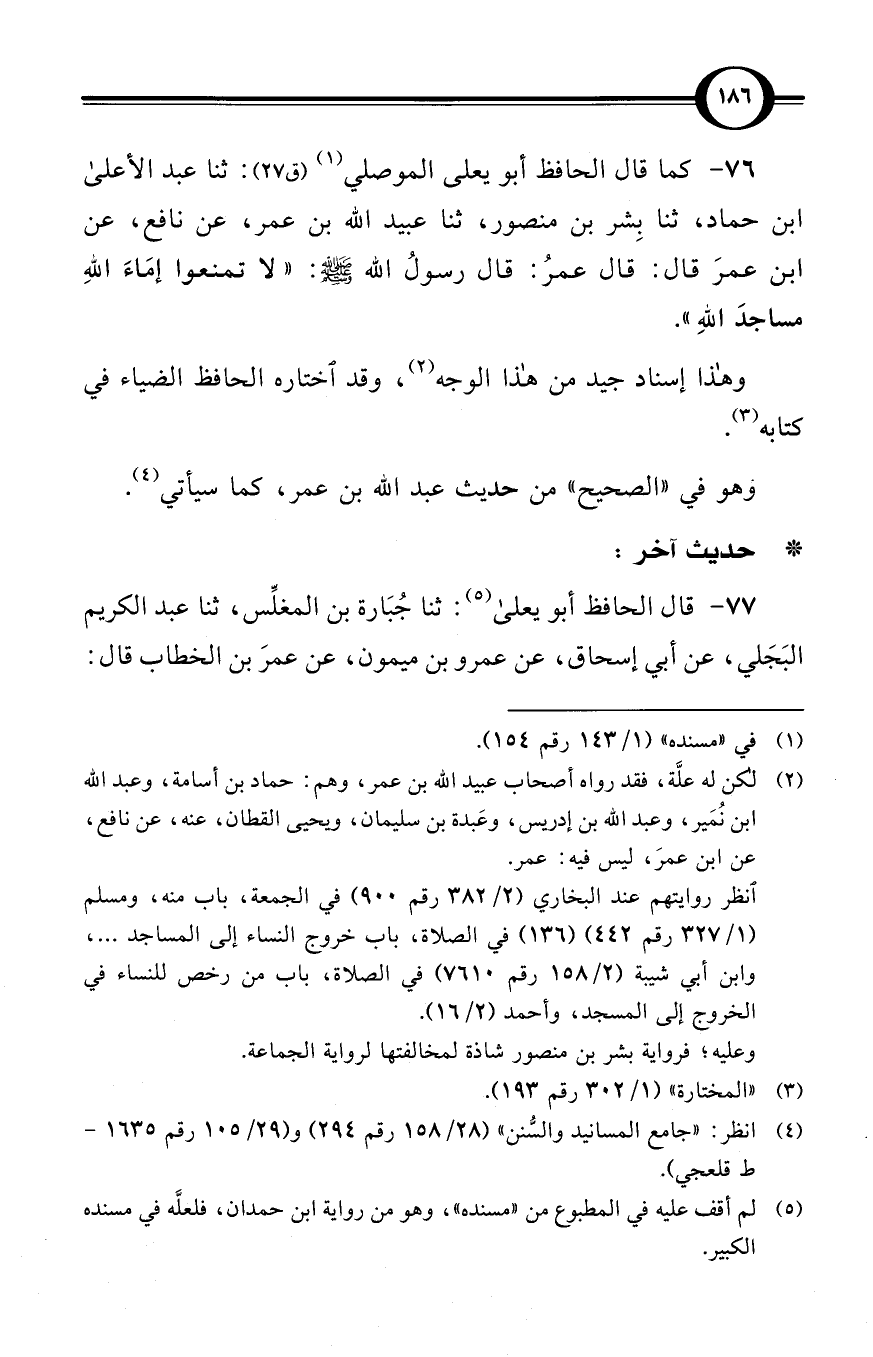 (76) كما قال الحافظ أبو يعلى الموصلي (¬1) / (ق 27): ثنا عبد الأعلى بن حماد، ثنا بِشر بن منصور، ثنا عبيد الله بن عمر، عن نافع، عن ابن عمرَ قال: قال عمرُ: قال رسولُ الله صلى الله عليه وسلم: «لا تمنعوا إمَاءَ اللهِ مساجدَ اللهِ».