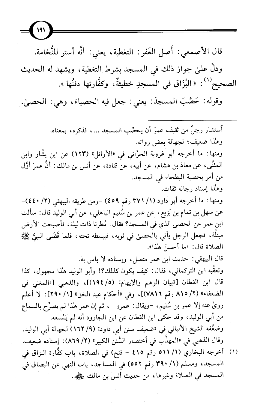 وقوله: حَصَّبَ المسجدَ: يعني: جعل فيه الحصباءَ، وهي: الحصى.