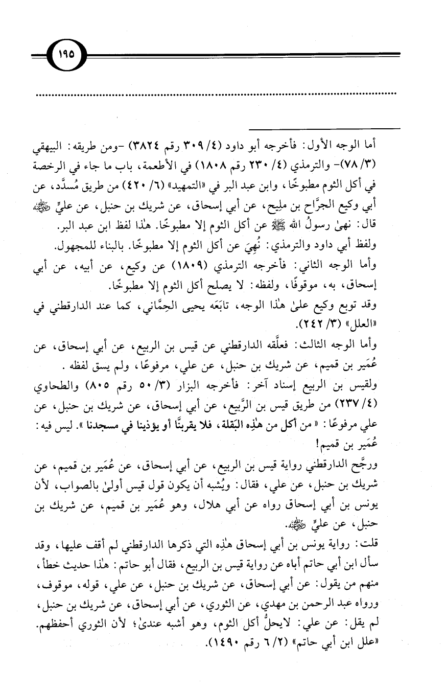 قلت: رواية يونس بن أبي إسحاق هذه التي ذكرها الدارقطني لم أجدها، وقد سأل ابن أبي حاتم أباه عن رواية قيس بن الربيع، فقال أبو حاتم: هذا حديث خطأ، منهم من يقول: عن أبي إسحاق، عن شريك بن حنبل، عن علي، قوله، موقوف، ورواه عبد الرحمن بن مهدي، عن الثوري، عن أبي إسحاق، عن شريك بن حنبل، لم يقل: عن علي: لايحلُّ أكل الثوم، وهو أشبه عندى؛ لأن الثوري أحفظهم. «علل ابن أبي حاتم» (2/ 6 رقم 1490).