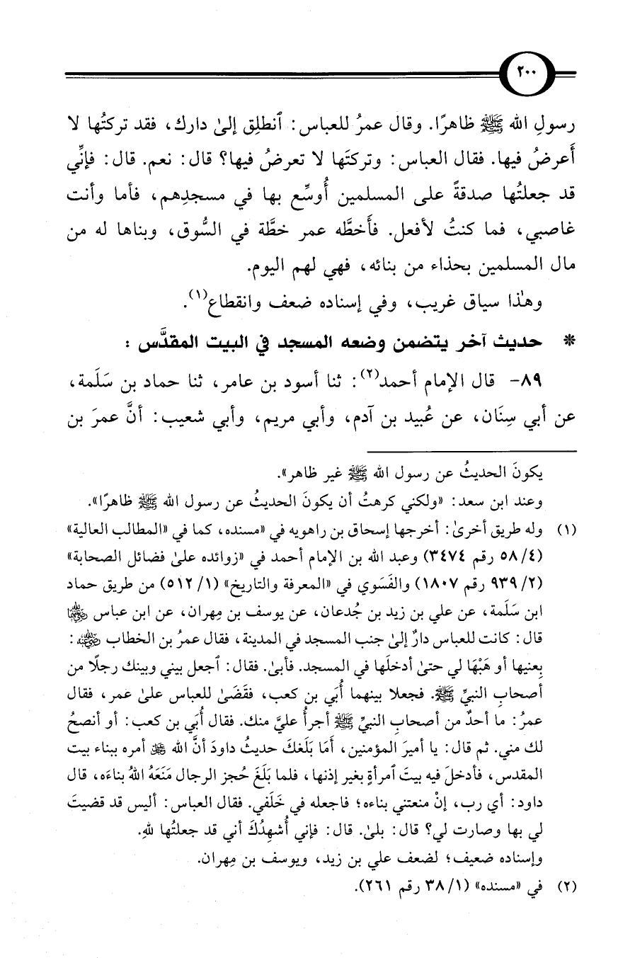 (¬1) وله طريق أخرى: أخرجها إسحاق بن راهويه في «مسنده، كما في» المطالب العالية «(4/ 58 رقم 3474) وعبد الله بن الإمام أحمد في» زوائده على فضائل الصحابة «(2/ 939 رقم 1807) والفَسَوي في «المعرفة والتاريخ» (1/ 512) من طريق حماد بن سَلَمة، عن علي بن زيد بن جُدعان، عن يوسف بن مِهران، عن ابن عباس -رضي الله عنهما- قال: كانت للعباس دارٌ إلى جنب المسجد في المدينة، فقال عمرُ بن الخطاب رضي الله عنه: بِعنيها أو هَبْهَا لي حتى أدخلَها في المسجد. فأبى. فقال: اجعل بيني وبينك رجلاً من أصحابِ النبيِّ صلى الله عليه وسلم. فجعلا بينهما أُبَي بن كعب، فقَضَى للعباس على عمر، فقال عمرُ: ما أحدٌ من أصحابِ النبيِّ صلى الله عليه وسلم أجرأُ عليَّ منك. فقال أُبَي بن كعب: أو أنصحُ لك مني. ثم قال: يا أميرَ المؤمنين، أَمَا بَلَغكَ حديثُ داودَ أنَّ الله عزَّ وجلَّ أمره ببناء بيت المقدس، فأدخلَ فيه بيتَ امرأةٍ بغير إذنها، فلما بَلَغَ حُجز الرجال مَنَعَهُ اللهُ بناءَه، قال داود: أي رب، إنْ منعتني بناءه؛ فاجعله في خَلَفي. فقال العباس: أليس قد قضيتَ لي بها وصارت لي؟ قال: بلى. قال: فإني أُشهِدُكَ أني قد جعلتُها للهِ.