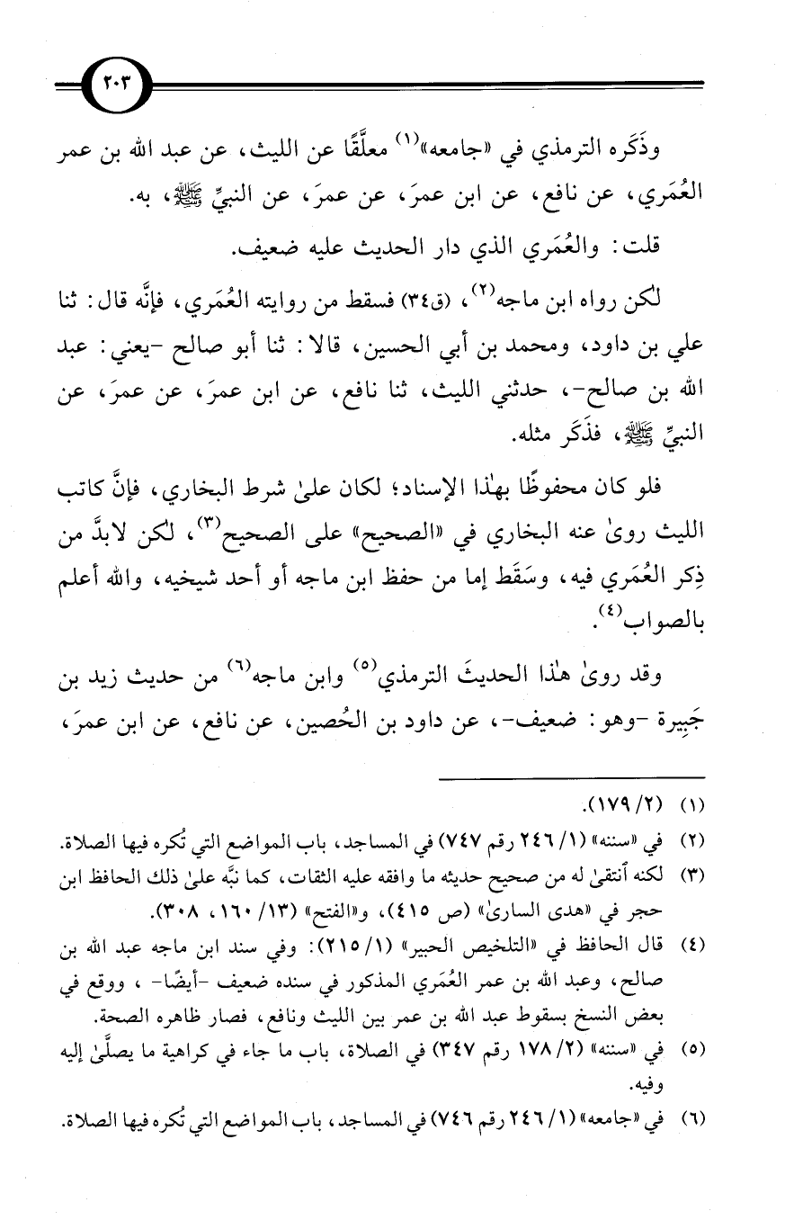 (¬4) قال الحافظ في «التلخيص الحبير» (1/ 215): وفي سند ابن ماجه عبد الله بن صالح، وعبد الله بن عمر العُمَري المذكور في سنده ضعيف -أيضًا-، ووقع في بعض النسخ بسقوط عبد الله بن عمر بين الليث ونافع، فصار ظاهره الصحة.