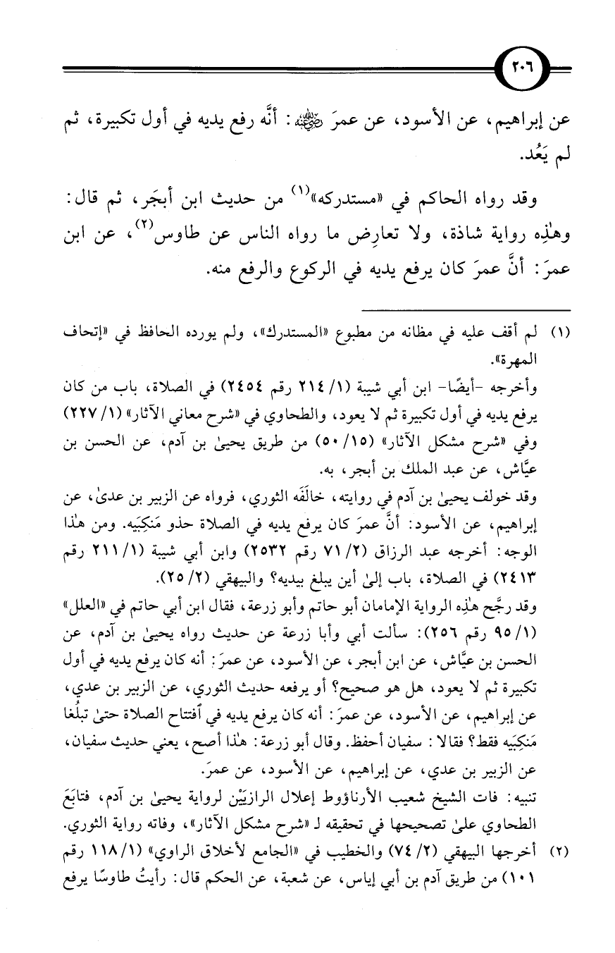 وقد رجَّح هذه الرواية الإمامان أبو حاتم وأبو زرعة، فقال ابن أبي حاتم في «العلل» (1/ 95 رقم 256): سألت أبي وأبا زرعة عن حديث رواه يحيى بن آدم، عن الحسن بن عيَّاش، عن ابن أبجر، عن الأسود، عن عمرَ: أنه كان يرفع يديه في أول تكبيرة ثم لا يعود، هل هو صحيح؟ أو يرفعه حديث الثوري، عن الزبير بن عدي، عن إبراهيم، عن الأسود، عن عمرَ: أنه كان يرفع يديه في افتتاح الصلاة حتى تبلُغا مَنكِبَيه فقط؟ فقالا: سفيان أحفظ. وقال أبو زرعة: هذا أصح، يعني حديث سفيان، عن الزبير بن عدي، عن إبراهيم، عن الأسود، عن عمرَ.