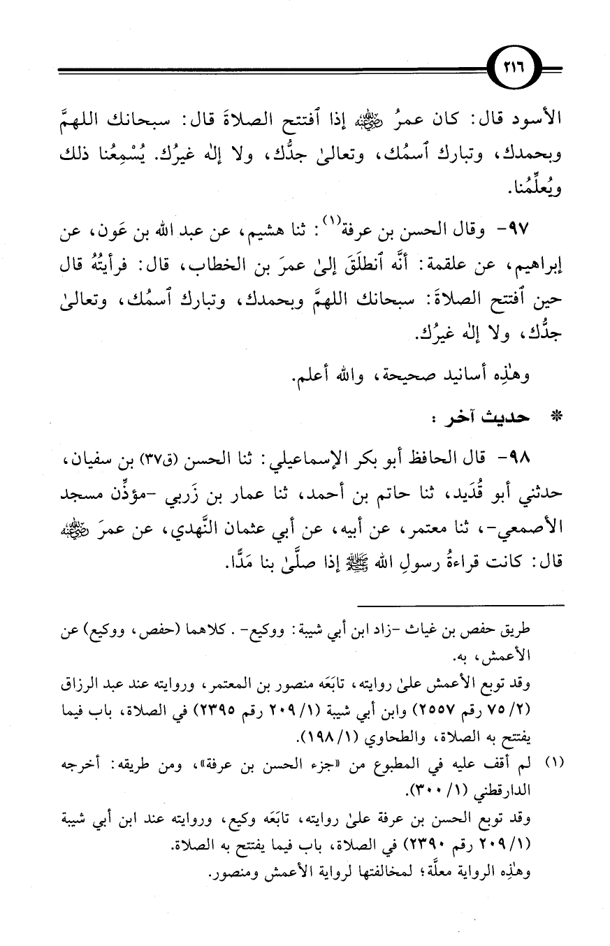 (97) وقال الحسن بن عرفة (¬1): ثنا هشيم، عن عبد الله بن عَون، عن إبراهيم، عن علقمة: أنَّه انطلَقَ إلى عمرَ بن الخطاب، قال: فرأيتُهُ قال حين افتتح الصلاةَ: سبحانك اللهمَّ وبحمدك، وتبارك اسمُك، وتعالى جدُّك، ولا إله غيرُك.