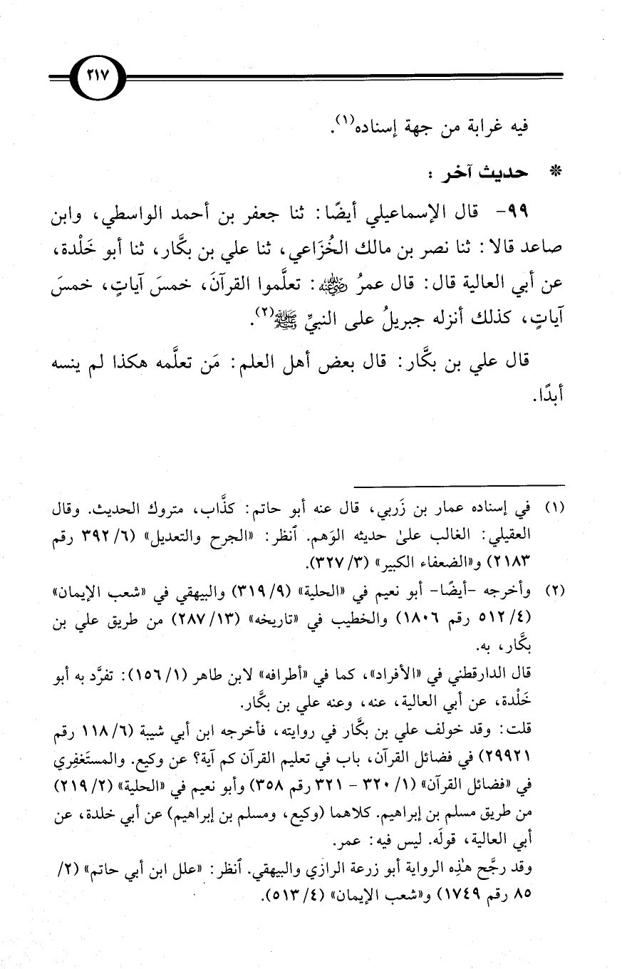 (99) قال الإسماعيلي أيضًا: ثنا جعفر بن أحمد الواسطي، وابن صاعد قالا: ثنا نصر بن مالك الخُزَاعي، ثنا علي بن بكَّار، ثنا أبو خَلْدة، عن أبي العالية قال: قال عمرُ رضي الله عنه: تعلَّموا القرآنَ، خمسَ آياتٍ، خمسَ آياتٍ، كذلك أنزله جبريلُ على النبيِّ صلى الله عليه وسلم (¬2).