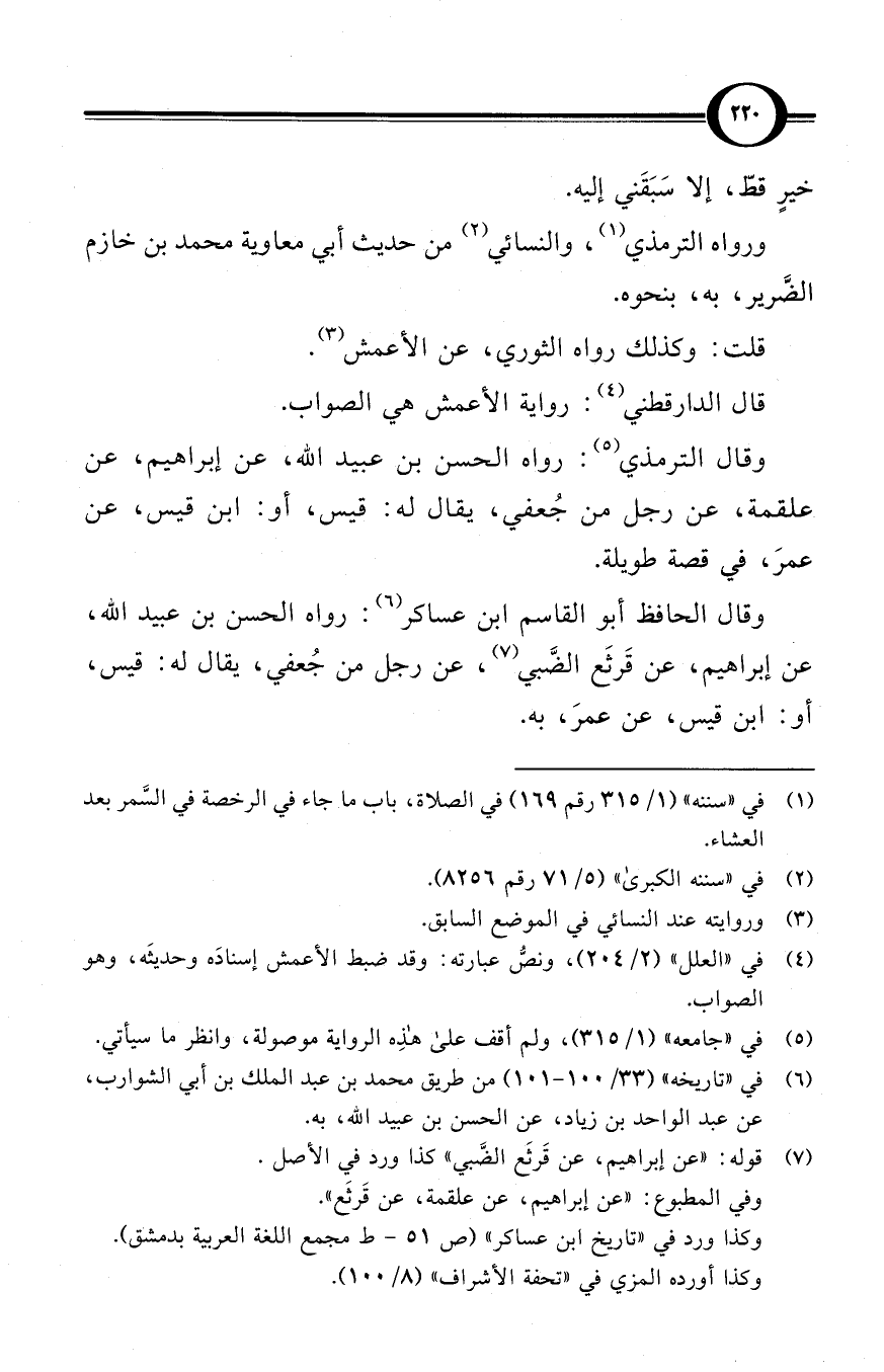 (¬1) في «سننه» (1/ 315 رقم 169) في الصلاة، باب ما جاء في الرخصة في السَّمر بعد العشاء.