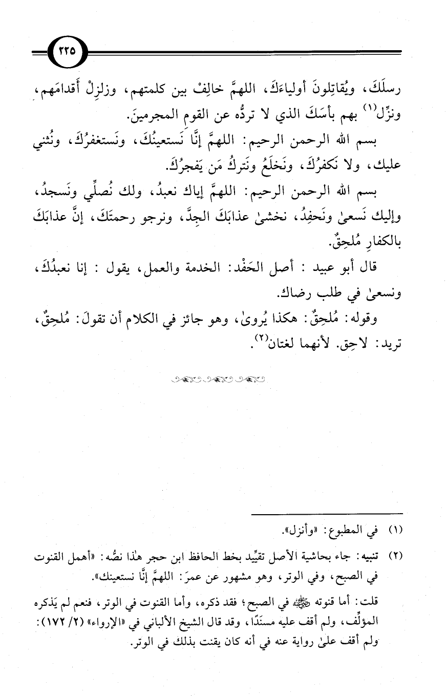 (¬2) تنبيه: جاء بحاشية الأصل تقيِّيد بخط الحافظ ابن حجر هذا نصُّه: «أهمل القنوت في الصبح، وفي الوتر، وهو مشهور عن عمرَ: اللهمَّ إنَّا نستعينك».
