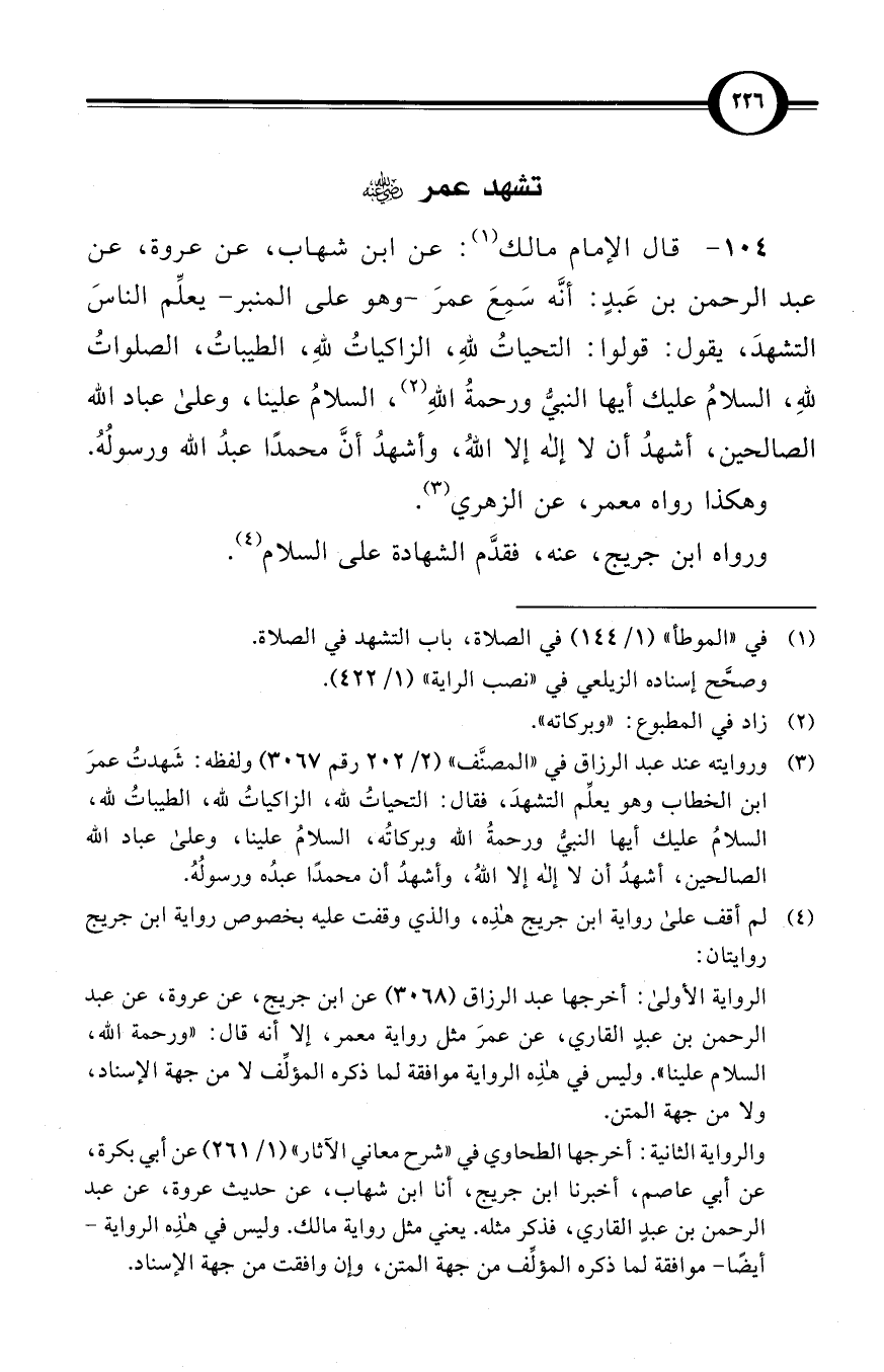 (104) قال الإمام مالك (¬1): عن ابن شهاب، عن عروة، عن عبد الرحمن بن عَبدٍ: أنَّه سَمِعَ عمرَ -وهو على المنبر- يعلِّم الناسَ التشهدَ، يقول: قولوا: التحياتُ للهِ، الزاكياتُ للهِ، الطيباتُ، الصلواتُ للهِ، السلامُ عليك أيها النبيُّ ورحمةُ اللهِ (¬2)، السلامُ علينا، وعلى عباد الله الصالحين، أشهدُ أن لا إلهَ إلا اللهُ، وأشهدُ أنَّ محمدًا عبدُ الله ورسولُهُ.