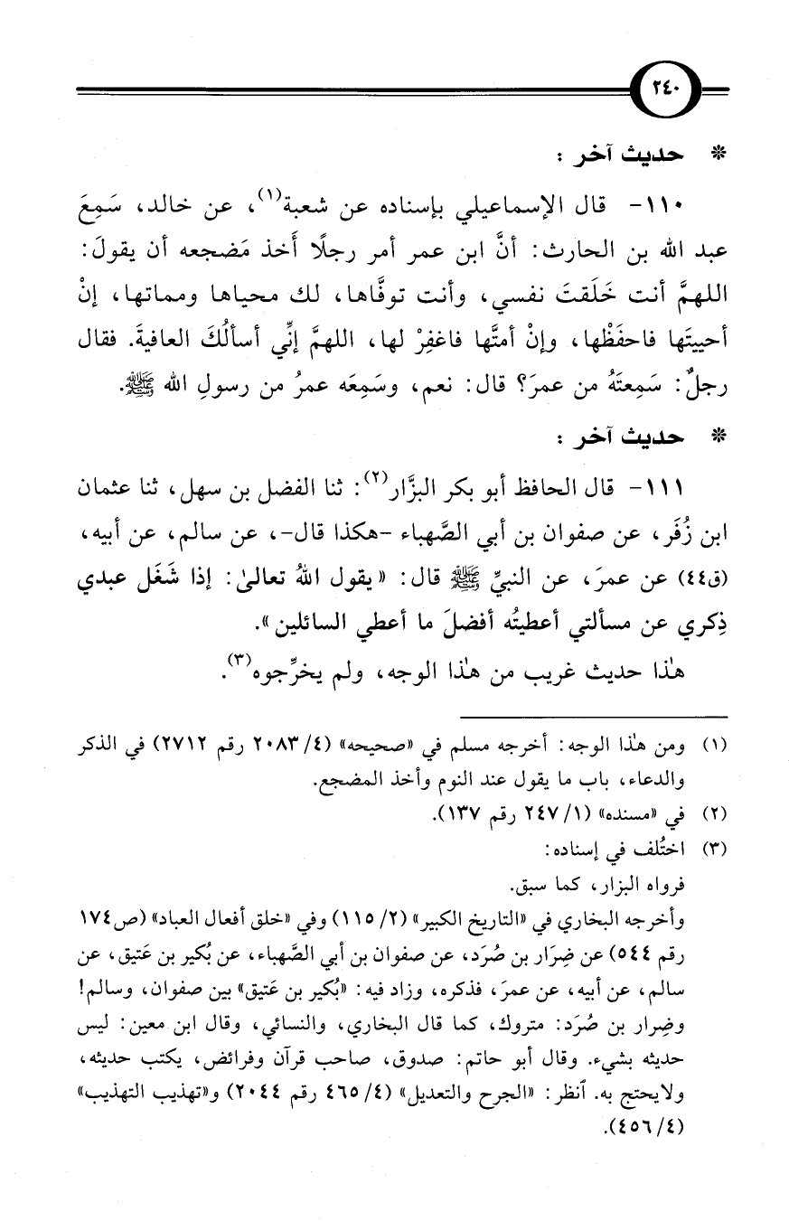 (110) قال الإسماعيلي بإسناده عن شعبة (¬1)، عن خالد، سَمِعَ عبد الله بن الحارث: أنَّ ابنَ عمر أمر رجلاً أَخذ مَضجعه أن يقولَ: اللهمَّ أنت خَلَقتَ نفسي، وأنت توفَّاها، لك محياها ومماتها، إنْ أحييتَها فاحفَظْها، وإنْ أمتَّها فاغفِرْ لها، اللهمَّ إنِّي أسألُكَ العافيةَ. فقال رجلٌ: سَمِعتَهُ من عمرَ؟ قال: نعم، وسَمِعَه عمرُ من رسولِ الله صلى الله عليه وسلم.