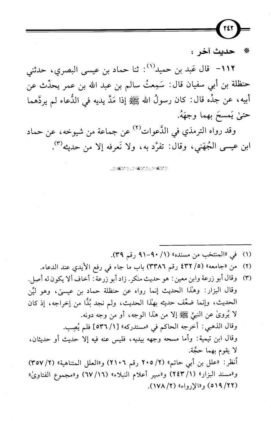 (112) قال عَبد بن حميد (¬1): ثنا حماد بن عيسى البصري، حدثني حنظلة بن أبي سفيان قال: سَمِعتُ سالم بن عبد الله بن عمر يحدِّث عن أبيه، عن جدِّه قال: كان رسولُ الله صلى الله عليه وسلم إذا مَدَّ يديه في الدُّعاء لم يردَّهما حتى يَمسحَ بهما وجهَهُ.