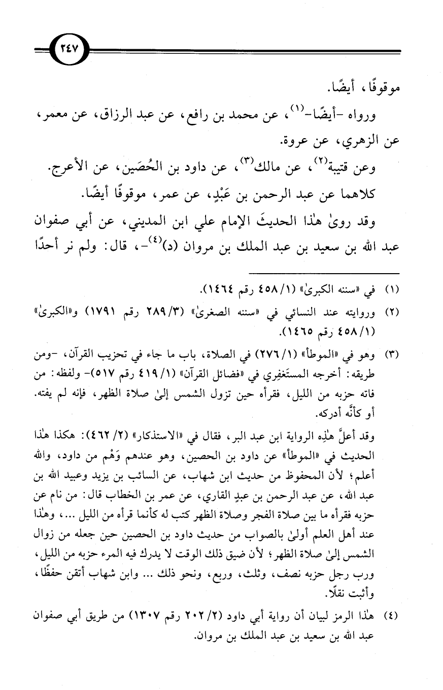 وقد أعلَّ هذه الرواية ابنُ عبد البر، فقال في «الاستذكار» (2/ 462): هكذا هذا الحديث في «الموطأ» عن داود بن الحصين، وهو عندهم وَهْم من داود، والله أعلم؛ لأن المحفوظ من حديث ابن شهاب، عن السائب بن يزيد وعبيد الله بن عبد الله، عن عبد الرحمن بن عبدٍ القاري، عن عمر بن الخطاب قال: من نام عن حزبه فقرأه ما بين صلاة الفجر وصلاة الظهر كتب له كأنما قرأه من الليل ... ، وهذا عند أهل العلم أولى بالصواب من حديث داود بن الحصين حين جعله من زوال الشمس إلى صلاة الظهر؛ لأن ضيق ذلك الوقت لا يدرك فيه المرء حزبه من الليل، ورب رجل حزبه نصف، وثلث، وربع، ونحو ذلك ... وابن شهاب أتقن حفظًا، وأثبت نقلاً.
