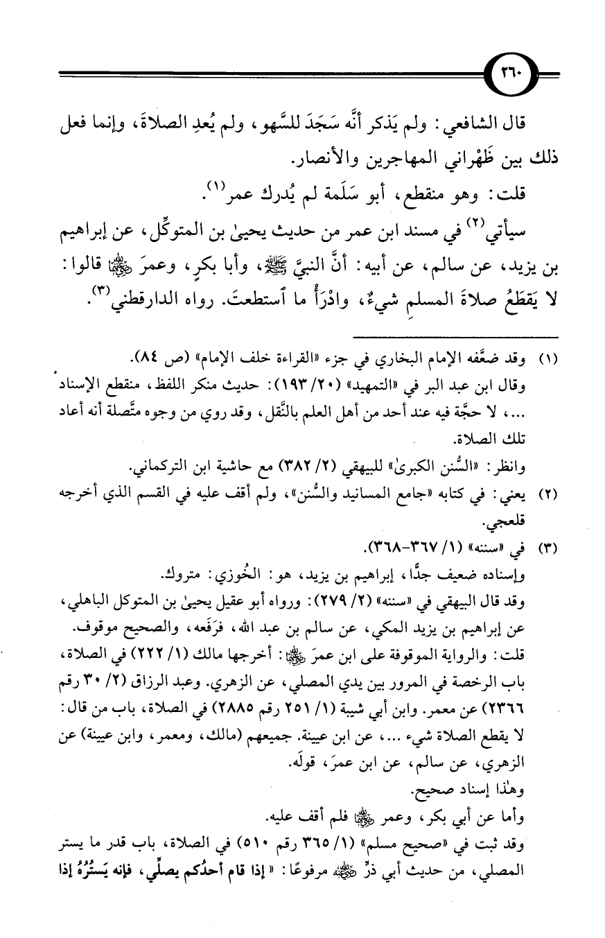قلت: والرواية الموقوفة على ابن عمرَ رضي الله عنهما: أخرجها مالك (1/ 222) في الصلاة، باب الرخصة في المرور بين يدي المصلي، عن الزهري. وعبد الرزاق (2/ 30 رقم 2366) عن معمر. وابن أبي شيبة (1/ 251 رقم 2885) في الصلاة، باب من قال: لا يقطع الصلاة شيء ... ، عن ابن عيينة. جميعهم (مالك، ومعمر، وابن عيينة) عن الزهري، عن سالم، عن ابن عمرَ، قولَه.