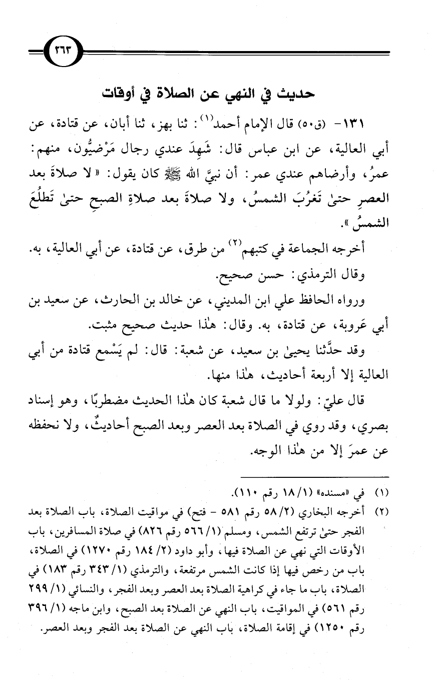 (131) / (ق 50) قال الإمام أحمد (¬1): ثنا بهز، ثنا أبان، عن قتادة، عن أبي العالية، عن ابن عباس قال: شَهِدَ عندي رجال مَرْضيُّون، منهم: عمرُ، وأرضاهم عندي عمر: أن نبيَّ الله صلى الله عليه وسلم كان يقول: «لا صلاةَ بعد العصرِ حتى تَغرُبَ الشمسُ، ولا صلاةَ بعد صلاةِ الصبحِ حتى تَطلُعَ الشمسُ».