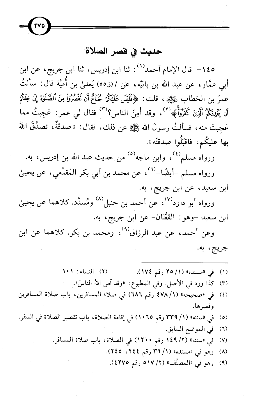 (145) قال الإمام أحمد (¬1): ثنا ابن إدريس، ثنا ابن جريج، عن ابن أبي عمَّار، عن عبد الله بن بابَيْه، عن / (ق 55) يَعلى بن أُميَّة قال: سألتُ عمرَ بن الخطاب -رضي الله عنه-، قلت: {فَلَيْسَ عَلَيْكُمْ جُنَاحٌ أَنْ تَقْصُرُوا مِنَ الصَّلَاةِ إِنْ خِفْتُمْ أَنْ يَفْتِنَكُمُ الَّذِينَ كَفَرُوا} (¬2)، وقد أَمِنَ الناس؟ (¬3) فقال لي عمر: عَجِبتُ مما عَجِبتَ منه، فسألتُ رسولَ الله صلى الله عليه وسلم عن ذلك، فقال: «صدقةٌ، تصدَّقَ اللهُ بها عليكُم، فاقبَلُوا صدقتَه».
