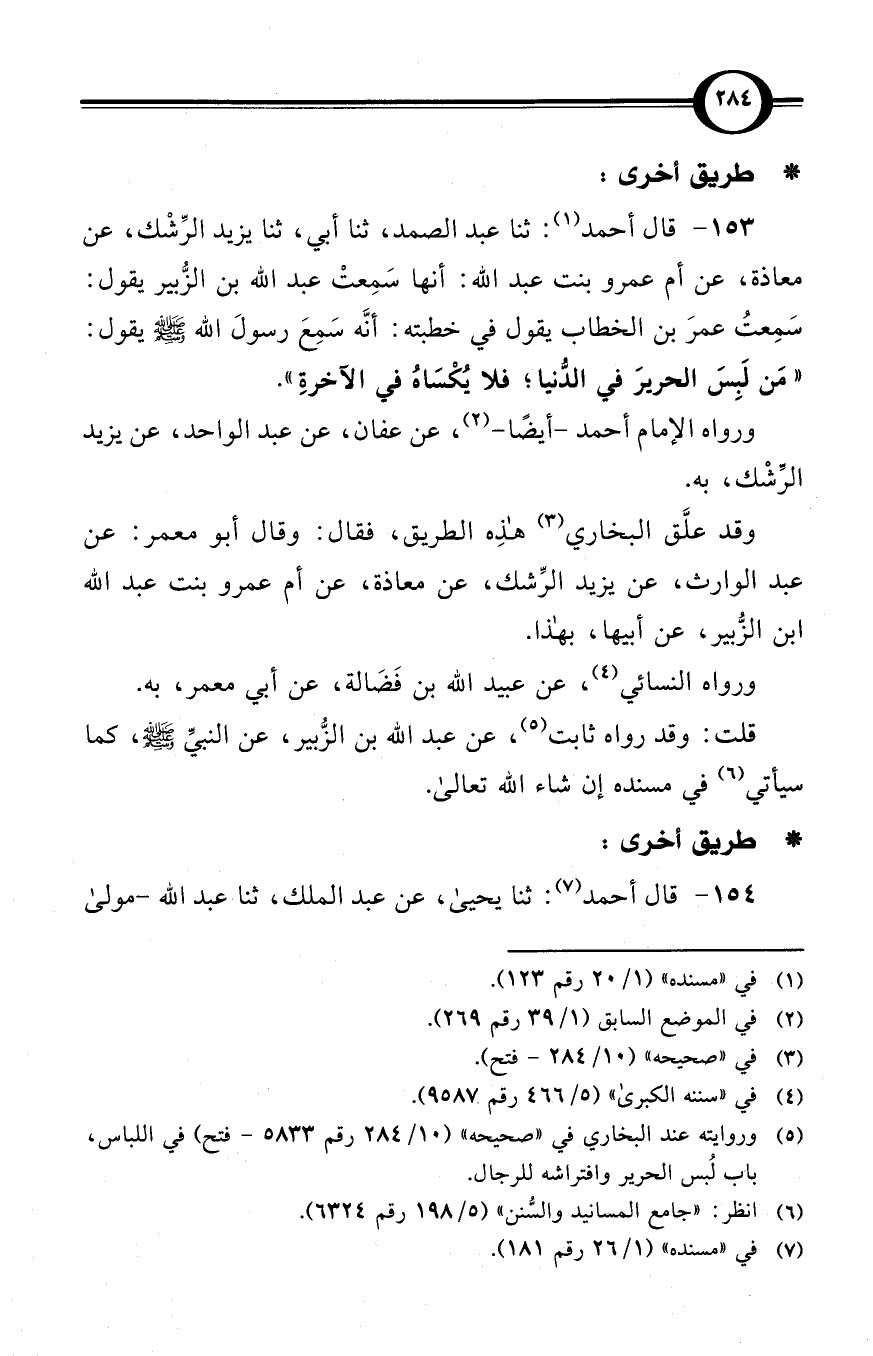 (153) قال أحمد (¬1): ثنا عبد الصمد، ثنا أبي، ثنا يزيد الرِّشْك، عن معاذة، عن أم عمرو بنت عبد الله: أنها سَمِعتْ عبد الله بن الزُّبير يقول: سَمِعتُ عمرَ بن الخطاب يقول في خطبته: أنَّه سَمِعَ رسولَ الله صلى الله عليه وسلم يقول: «مَن لَبِسَ الحريرَ في الدُّنيا؛ فلا يُكْسَاهُ في الآخرةِ».
