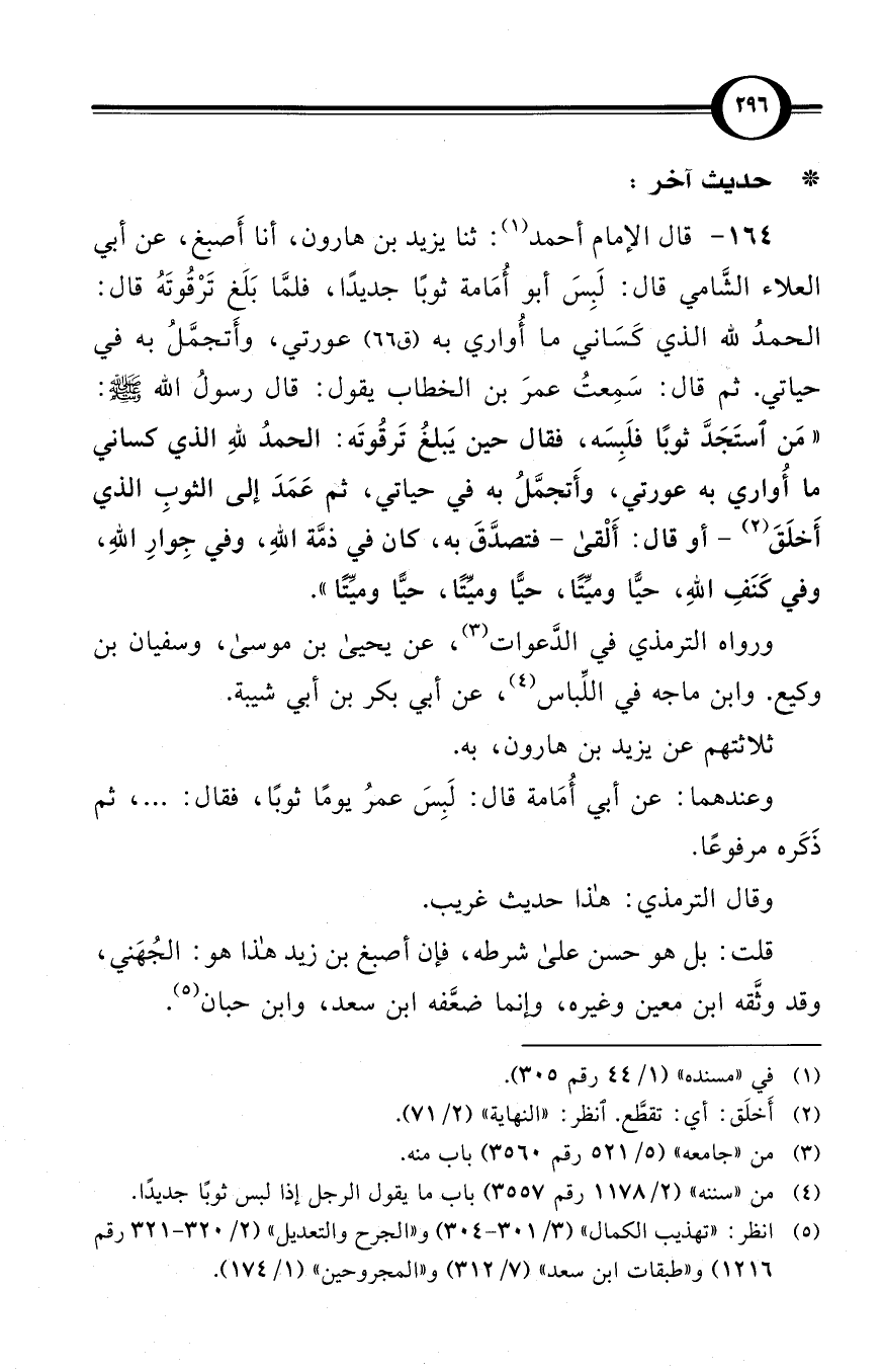 (164) قال الإمام أحمد (¬1): ثنا يزيد بن هارون، أنا أَصبغ، عن أبي العلاء الشَّامي قال: لَبِسَ أبو أُمَامة ثوبًا جديدًا، فلمَّا بَلَغ تَرْقُوتَهُ قال: الحمدُ لله الذي كَسَاني ما أُواري به / (ق 66) عورتي، وأَتجمَّلُ به في حياتي. ثم قال: سَمِعتُ عمرَ بن الخطاب يقول: قال رسولُ الله صلى الله عليه وسلم: «مَن استَجَدَّ ثوبًا فلَبِسَه، فقال حين يَبلغُ تَرقُوتَه: الحمدُ للهِ الذي كساني ما أُواري به عورتي، وأَتجمَّلُ به في حياتي، ثم عَمَدَ إلى الثوبِ الذي أَخلَقَ (¬2) - أو قال: أَلْقى - فتصدَّقَ به، كان في ذمَّة اللهِ، وفي جِوارِ اللهِ، وفي كَنَفِ اللهِ، حيًّا وميِّتًا، حيًّا وميِّتًا، حيًّا وميِّتًا».