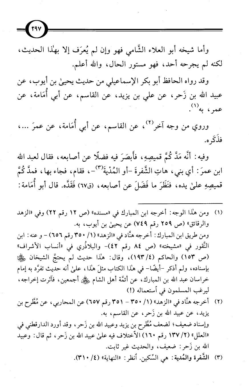 ومن طريق ابن المبارك: أخرجه هنَّاد في «الزهد» (1/ 350 رقم 656) -وعنه: ابن النَّقور في «مشيخته» (ص 84 رقم 42) - والبلاذُري في «أنساب الأشراف» (ص 153) والحاكم (4/ 193)، وقال: هذا حديث لم يحتجَّ الشيخان -رضي الله عنهما- بإسناده، ولم أذكر -أيضًا- في هذا الكتاب مثلَ هذا، على أنه حديث تفرَّد به إمام خراسان عبد الله بن المبارك، عن أئمَّة أهل الشام -رضي الله عنهم أجمعين-، فآثرت إخراجه، ليرغب المسلمون في استعماله (!)
