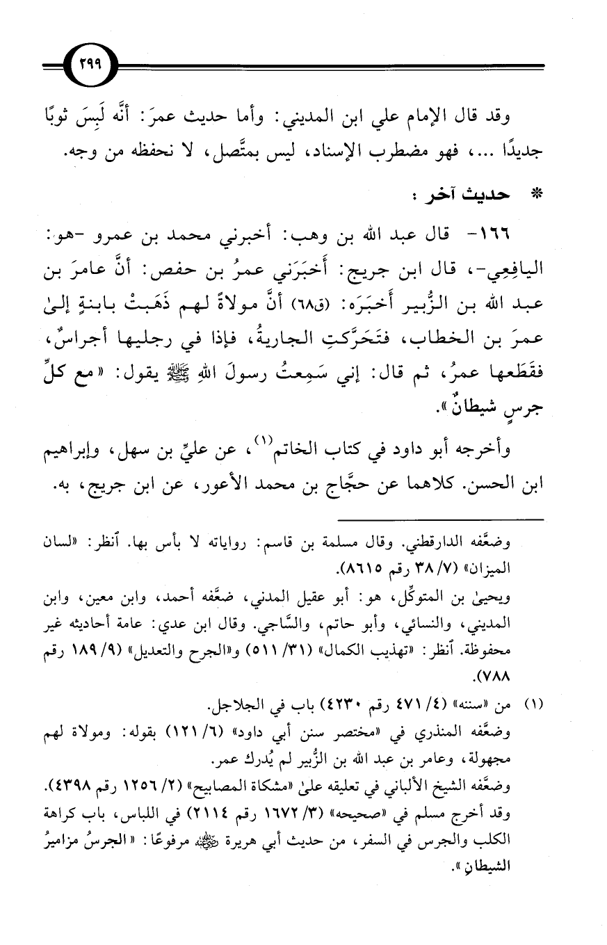 (166) قال عبد الله بن وهب: أخبرني محمد بن عمرو -هو: اليافِعِي-، قال ابن جريج: أَخبَرَني عمرُ بن حفص: أنَّ عامرَ بن عبد الله بن الزُّبير أَخبَرَه: / (ق 68) أنَّ مولاةً لهم ذَهَبتْ بابنةٍ إلى عمرَ بن الخطاب، فتَحَرَّكتِ الجاريةُ، فإذا في رجليها أجراسٌ، فقَطَعها عمرُ، ثم قال: إني سَمِعتُ رسولَ اللهِ صلى الله عليه وسلم يقول: «مع كلِّ جرسٍ شيطانٌ».