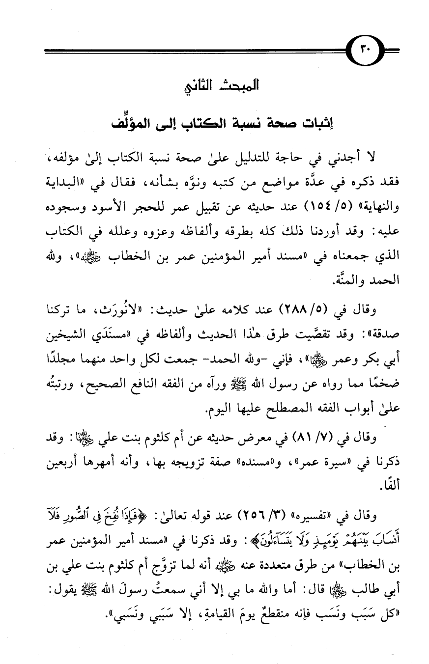 وقال في «تفسيره» (3/ 256) عند قوله تعالى: {فإذا نفخ في الصور فلا أنساب بينهم يومئذ ولا يتساءلون}: وقد ذكرنا في «مسند أمير المؤمنين عمر بن الخطاب» من طرق متعددة عنه -رضي الله عنه- أنه لما تزوَّج أم كلثوم بنت علي بن أبي طالب -رضي الله عنهما- قال: أما والله ما بي إلا أني سمعتُ رسولَ الله صلى الله عليه وسلم يقول: «كل سَبَب ونَسَب فإنه منقطعٌ يومَ القيامةِ، إلا سَبَبي ونَسَبي».