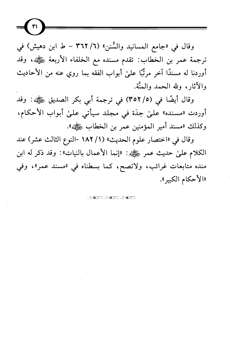 وقال في «جامع المسانيد والسُّنن» (6/ 362 - ط ابن دهيش) في ترجمة عمر بن الخطاب: تقدم مسنده مع الخلفاء الأربعة -رضي الله عنه-، وقد أوردنا له مسندًا آخر مرتَّبًا على أبواب الفقه بما روي عنه من الأحاديث والآثار، ولله الحمد والمنَّة.