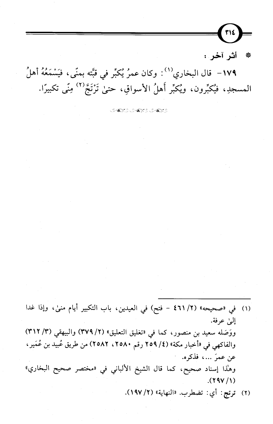 (179) قال البخاري (¬1): وكان عمرُ يُكبِّر في قبَّته بمنًى، فيَسْمَعُهُ أهلُ المسجدِ، فيُكبِّرون، ويُكبِّر أَهلُ الأسواقِ، حتى تَرْتَجَّ (¬2) مِنًى تكبيرًا.