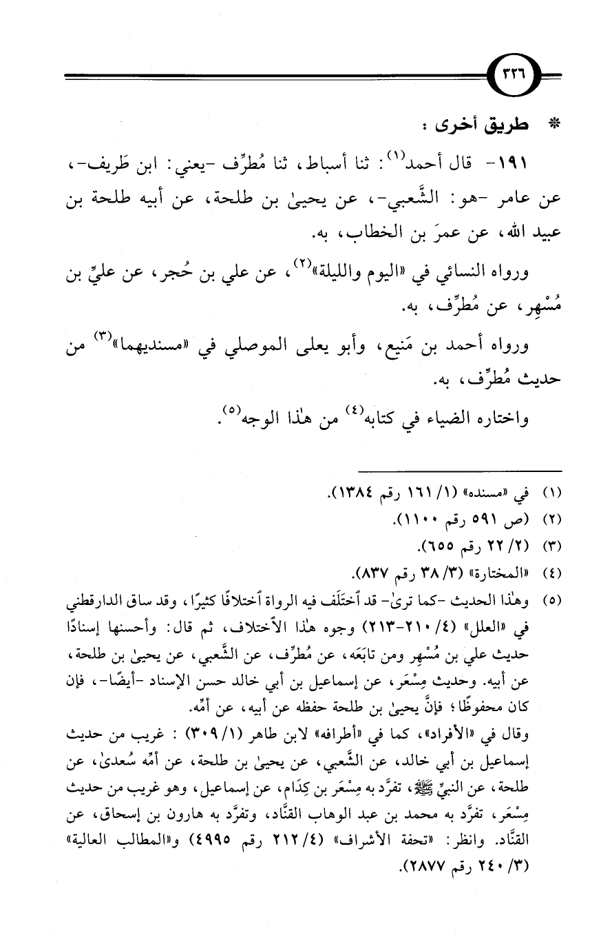 (¬5) وهذا الحديث -كما ترى- قد اختَلَف فيه الرواة اختلافًا كثيرًا، وقد ساق الدارقطني في «العلل» (4/ 210 - 213) وجوه هذا الاختلاف، ثم قال: وأحسنها إسنادًا حديث علي بن مُسْهِر ومن تابَعَه، عن مُطرِّف، عن الشَّعبي، عن يحيى بن طلحة، عن أبيه. وحديث مِسْعَر، عن إسماعيل بن أبي خالد حسن الإسناد -أيضًا-، فإن كان محفوظًا؛ فإنَّ يحيى بن طلحة حفظه عن أبيه، عن أمِّه.