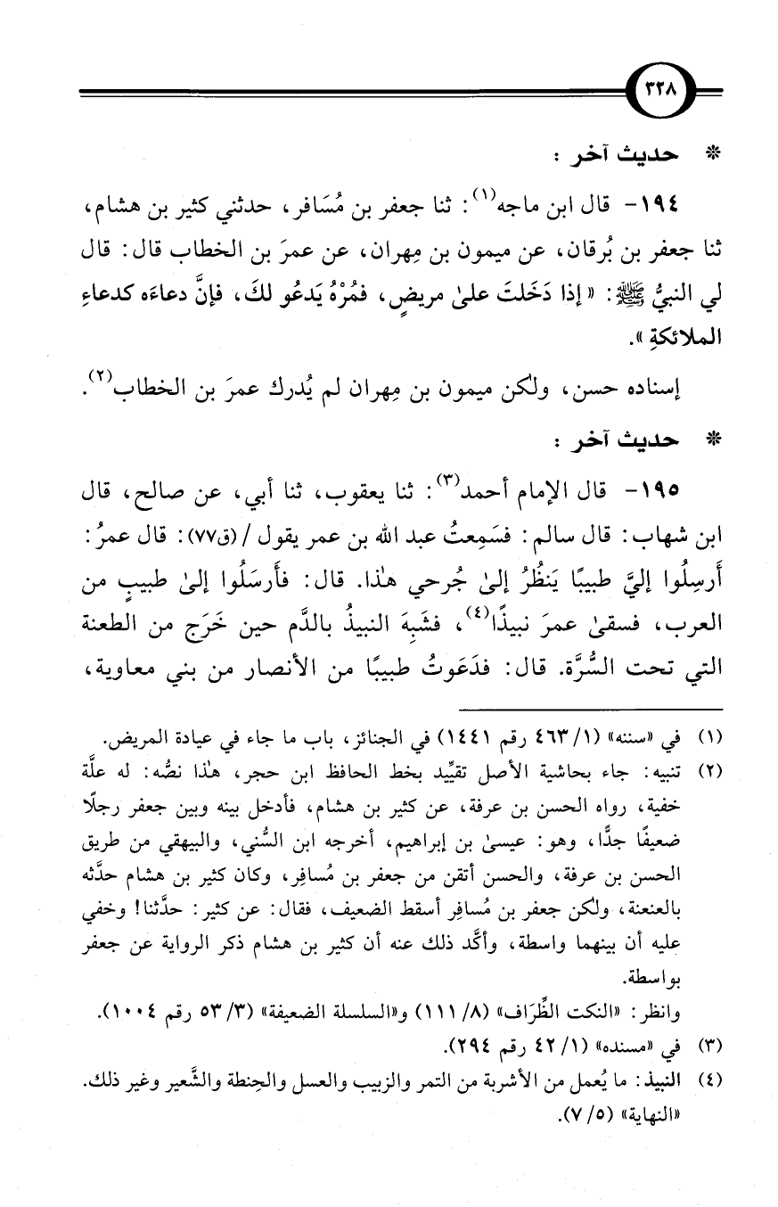 (194) قال ابن ماجه (¬1): ثنا جعفر بن مُسَافر، حدثني كثير بن هشام، ثنا جعفر بن بُرقان، عن ميمون بن مِهران، عن عمرَ بن الخطاب قال: قال لي النبيُّ صلى الله عليه وسلم: «إذا دَخَلتَ على مريضٍ، فمُرْهُ يَدعُو لكَ، فإنَّ دعاءَه كدعاءِ الملائكةِ».