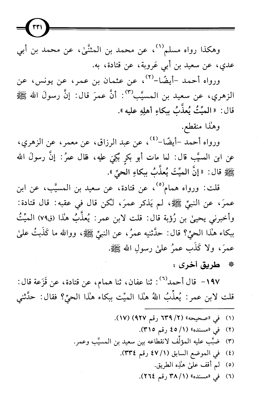 ورواه أحمد -أيضًا- (¬2)، عن عثمان بن عمر، عن يونس، عن الزهري، عن سعيد بن المسيّب (¬3): أنَّ عمرَ قال: إنَّ رسولَ الله صلى الله عليه وسلم قال: «الميِّتُ يُعذَّبُ ببكاءِ أهلِهِ عليه».