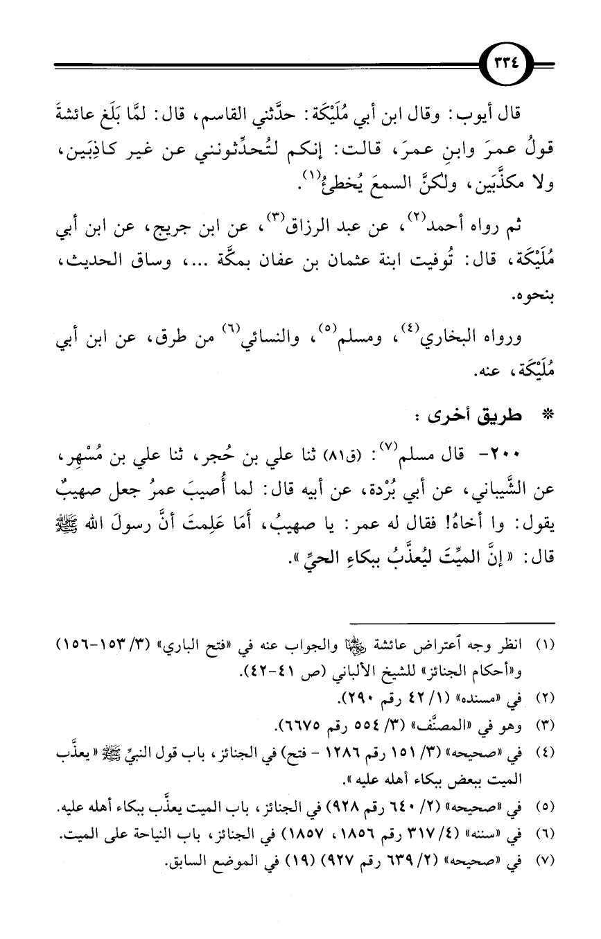 (200) قال مسلم (¬7): / (ق 81) ثنا علي بن حُجر، ثنا علي بن مُسْهِر، عن الشَّيباني، عن أبي بُرْدة، عن أبيه قال: لما أُصيبَ عمرُ جعل صهيبٌ يقول: وا أخاهُ! فقال له عمر: يا صهيبُ، أَمَا عَلِمتَ أنَّ رسولَ الله صلى الله عليه وسلم قال: «إنَّ الميِّتَ ليُعذَّبُ ببكاءِ الحيِّ».
