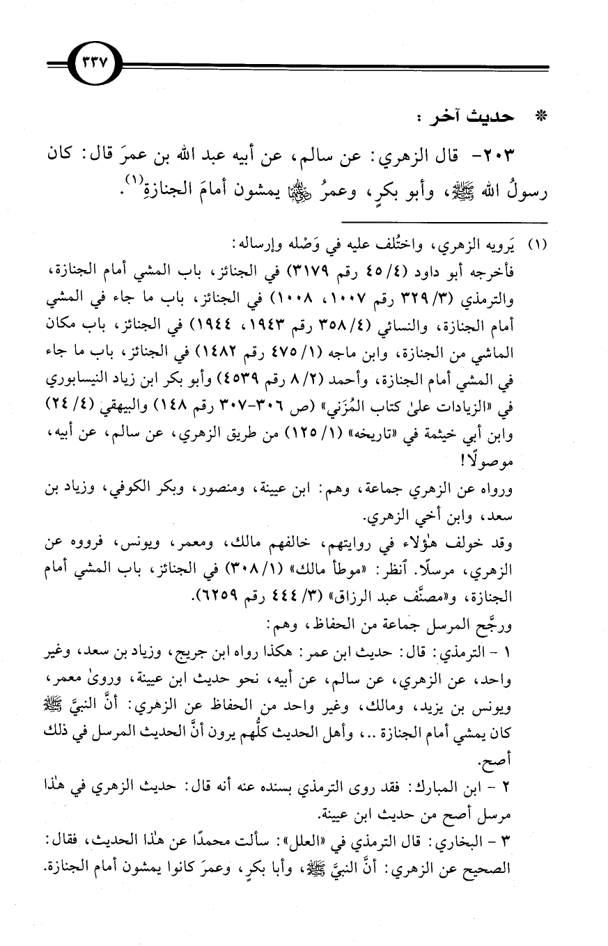 (203) قال الزهري: عن سالم، عن أبيه عبد الله بن عمرَ قال: كان رسولُ الله صلى الله عليه وسلم، وأبو بكرٍ، وعمرُ -رضي الله عنهما- يمشون أمامَ الجنازةِ (¬1).
