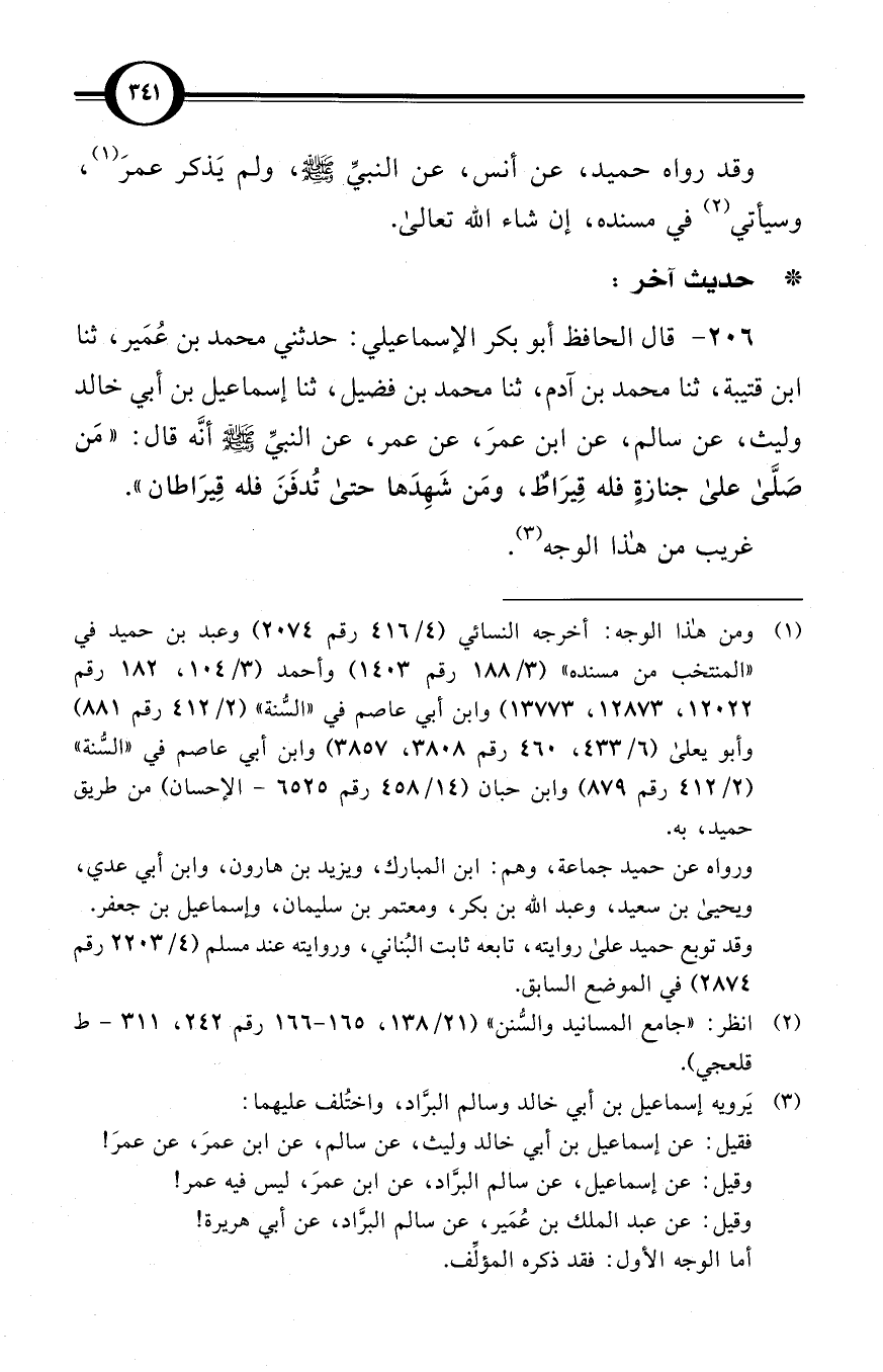 (206) قال الحافظ أبو بكر الإسماعيلي: حدثني محمد بن عُمَير، ثنا ابن قتيبة، ثنا محمد بن آدم، ثنا محمد بن فضيل، ثنا إسماعيل بن أبي خالد وليث، عن سالم، عن ابن عمرَ، عن عمر، عن النبيِّ صلى الله عليه وسلم أنَّه قال: «مَن صَلَّى على جنازةٍ فله قِيرَاطٌ، ومَن شَهِدَها حتى تُدفَنَ فله قِيرَاطان».