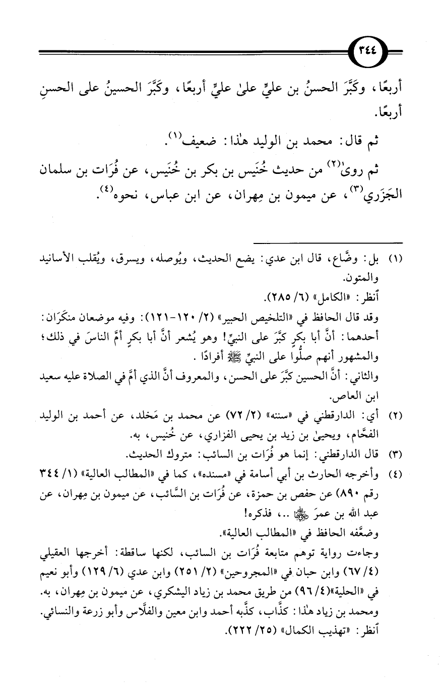أربعًا، وكَبَّرَ الحسنُ بن عليٍّ على عليٍّ أربعًا، وكَبَّرَ الحسينُ على الحسنِ أربعًا.
