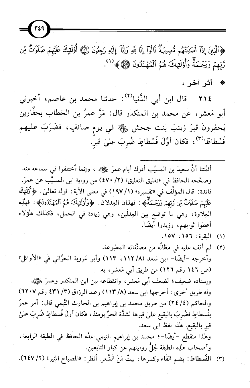 (214) قال ابن أبي الدُّنيا (¬2): حدثنا محمد بن عاصم، أخبرني أبو مَعشر، عن محمد بن المنكدر قال: مَرَّ عمرُ بن الخطاب بحفَّارين يَحفرونَ قبرَ زينبَ بنت جحش -رضي الله عنها- في يومٍ صائفٍ، فضَرَبَ عليهم فُسْطاطًا (¬3)، فكان أوَّلَ فُسْطاطٍ ضُرِبَ على قبرٍ.
